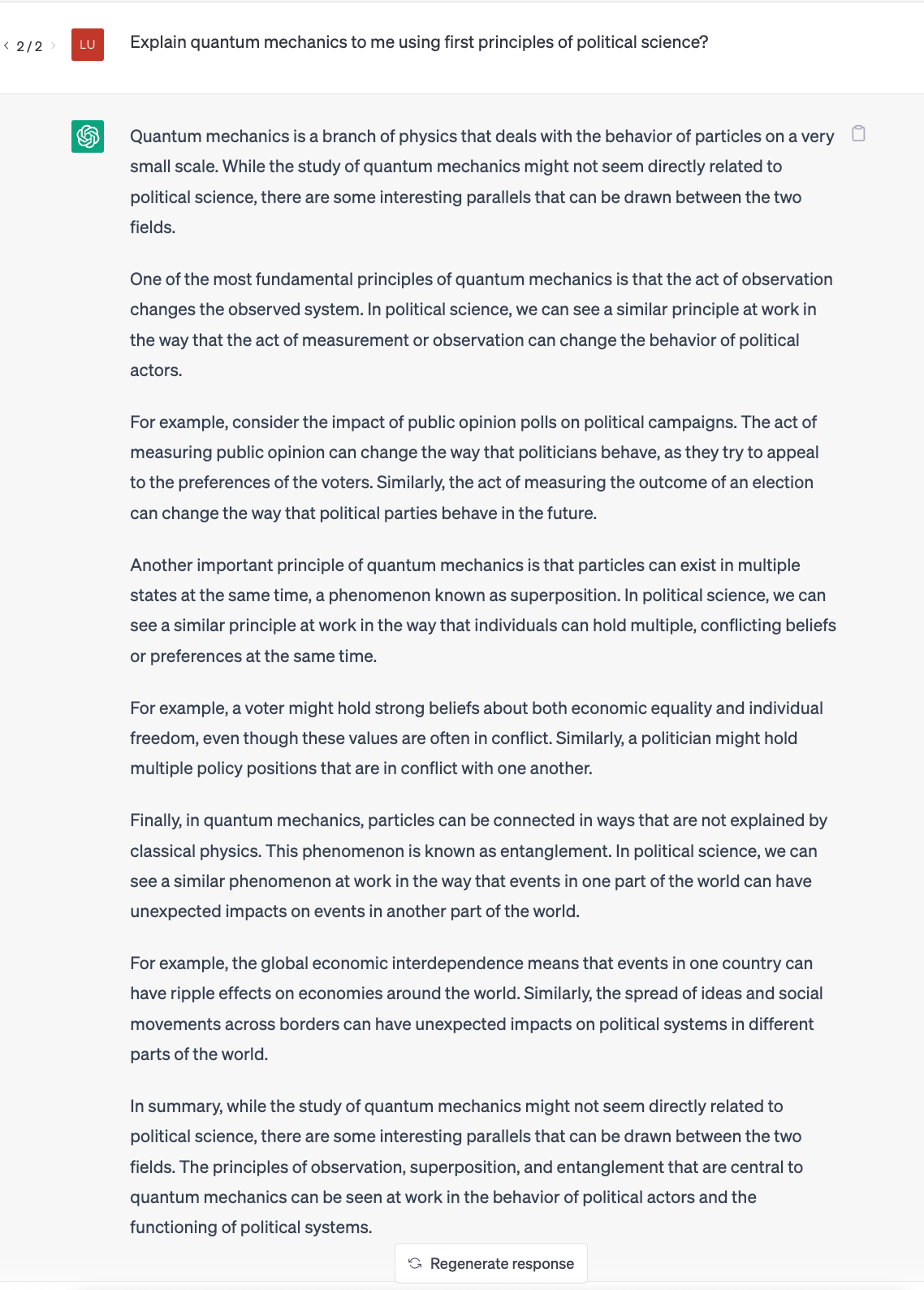 Now, let’s have some fun by asking something niche or absurd. In this case something absurd. “Explain quantum mechanics to me using first principles of political science?” The response is attached below for your examination and enjoyment.