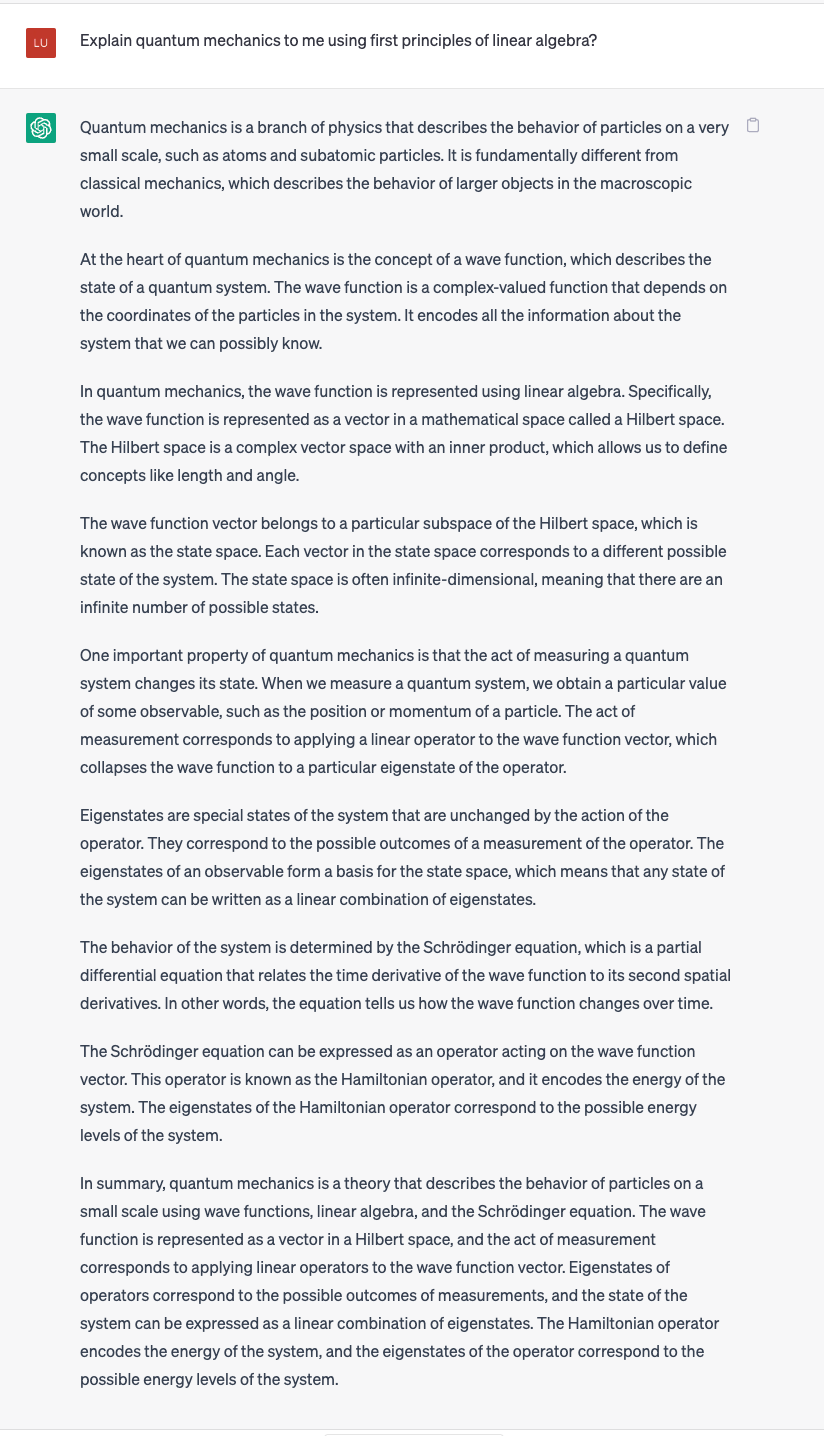 In the first scenario, I asked ChatGPT to explain quantum mechanics to me using the first principles of linear algebra, something well documented. It did a fair job without any instruction tuning.